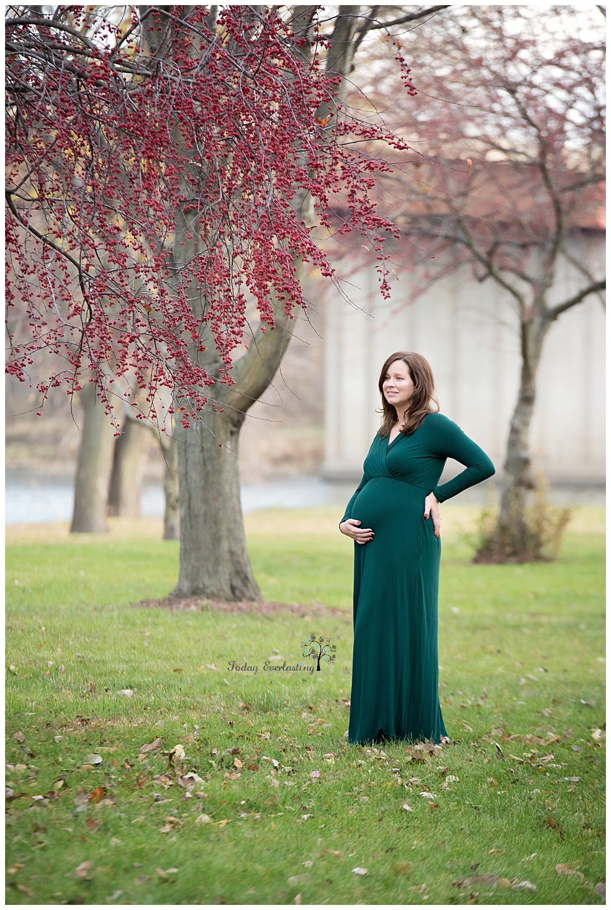 Outdoor maternity portrait featuring a woman in a long, emerald green dress, standing under a tree with branches adorned with small red berries. She gently cradles her belly, surrounded by a natural, serene setting with soft, neutral colors in the background.